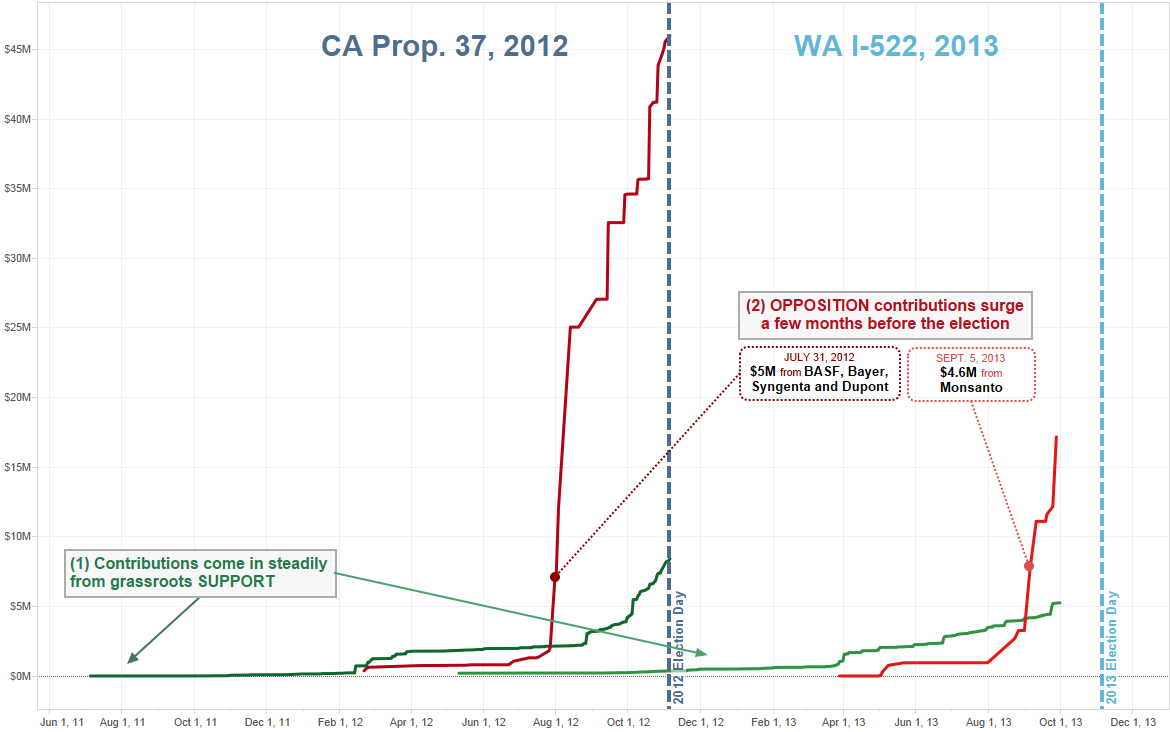 Opposition to a Washington State ballot initiative to require labels on products containing genetically modified crops has grown exponentially over the past two months. The initiative, I-522, is a sibling to California's 2012 Proposition 37: many of the major contributors in this race also contributed to committees for or against Proposition 37, and the recent spike in opposition dollars echoes last year when the opposition to Proposition 37 "bankrolled" a "media blitz" in the final stretch.